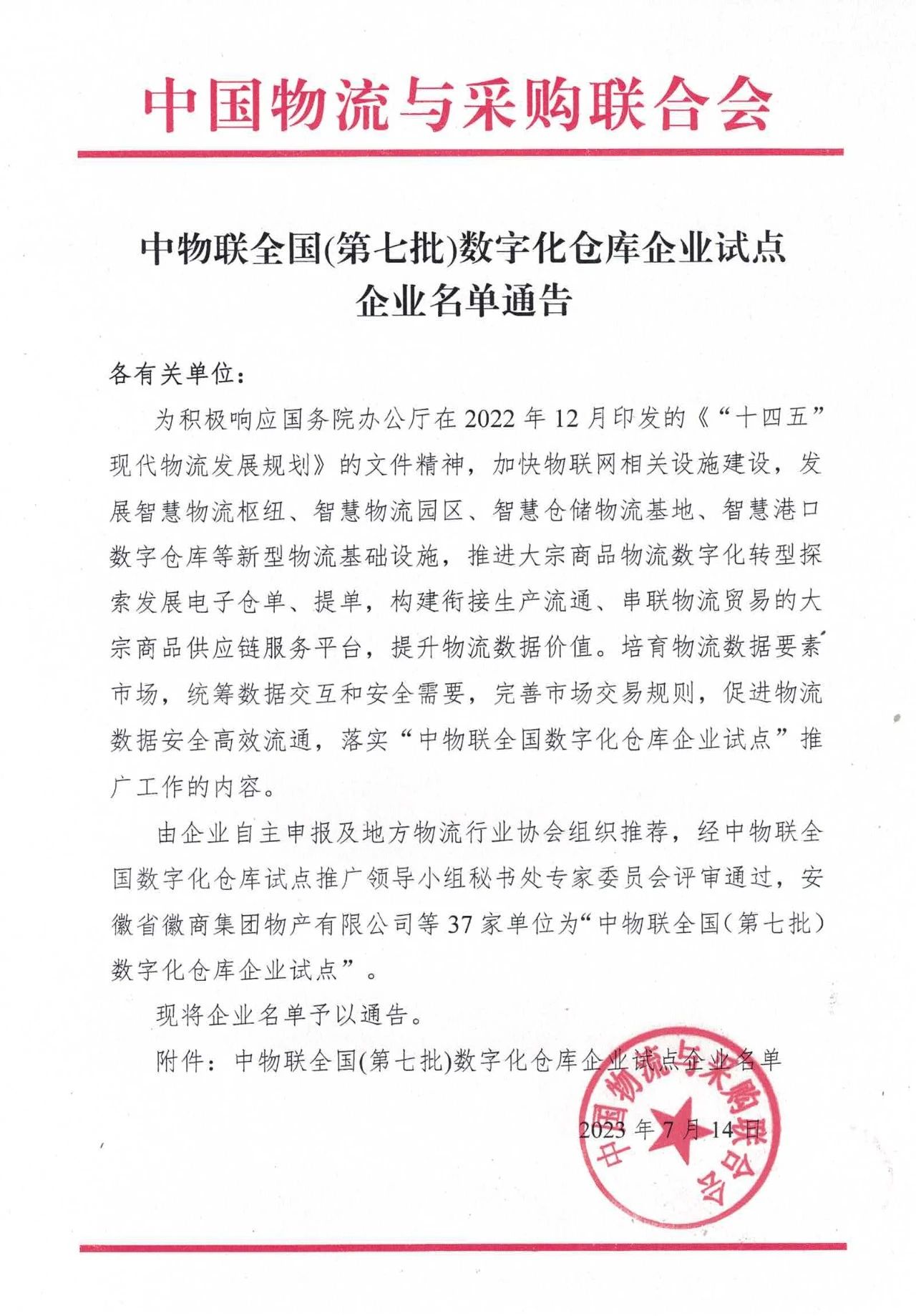 2023年7月14日,中國物流與采購聯(lián)合會(huì)公布了 “中物聯(lián)全國(第七批)數(shù)字化倉庫企業(yè)試點(diǎn)”單位名單,共計(jì)37家單位。依托“河北省智慧物流產(chǎn)園區(qū)”項(xiàng)目建設(shè)、運(yùn)營,河北物產(chǎn)供應(yīng)鏈有限公司經(jīng)中物聯(lián)全國數(shù)字化倉庫試點(diǎn)推廣領(lǐng)導(dǎo)小組秘書處專家委員會(huì)評(píng)審?fù)ㄟ^,列入了本次試點(diǎn)名單中。